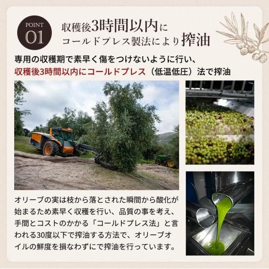このオリーブオイルは、品質管理には特にこだわり、収穫から出荷までの全行程を100%管理しています。