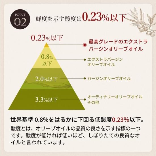 • オリーブオイルの品質を表す酸度は、基準値である0.8%を大きく下回る0.23%です。