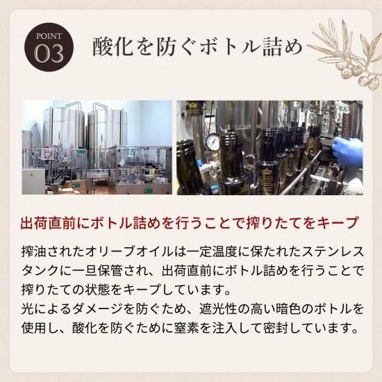 搾油されたオリーブオイルは一定温度に保たれたステンレスタンクに一旦保管されます。その後、出荷直前にボトル詰めを行うことで搾りたての状態をキープすることができます。ボトルは光によるダメージを防ぐため、遮光性の高い暗色のボトルを使います。さらに窒素を注入することで空気から完全に遮断して酸化を防いでいます。