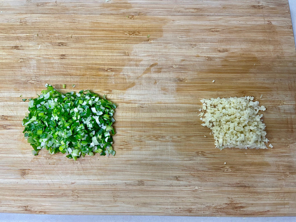 - 青ネギの白い部分50gと生姜20gを微塵切りにします。