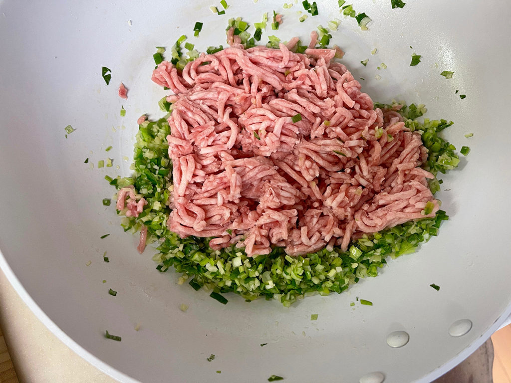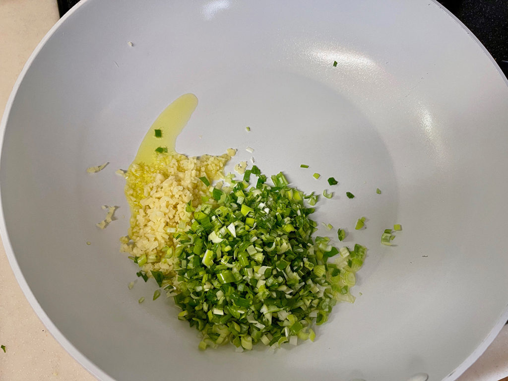 - フライパンにオリーブオイルを引き、青ネギと生姜を炒めます。