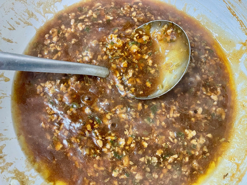 - 甜麺醤30g、豆板醤 2〜3gを入れ30秒ほど炒めたら、水500ml、鶏ガラスープの素10g、濃口醤油大さじ1、味醂大さじ1を入れてひと煮立ちしたら、灰汁をすくいます。水溶き片栗粉でとろみをつけます。