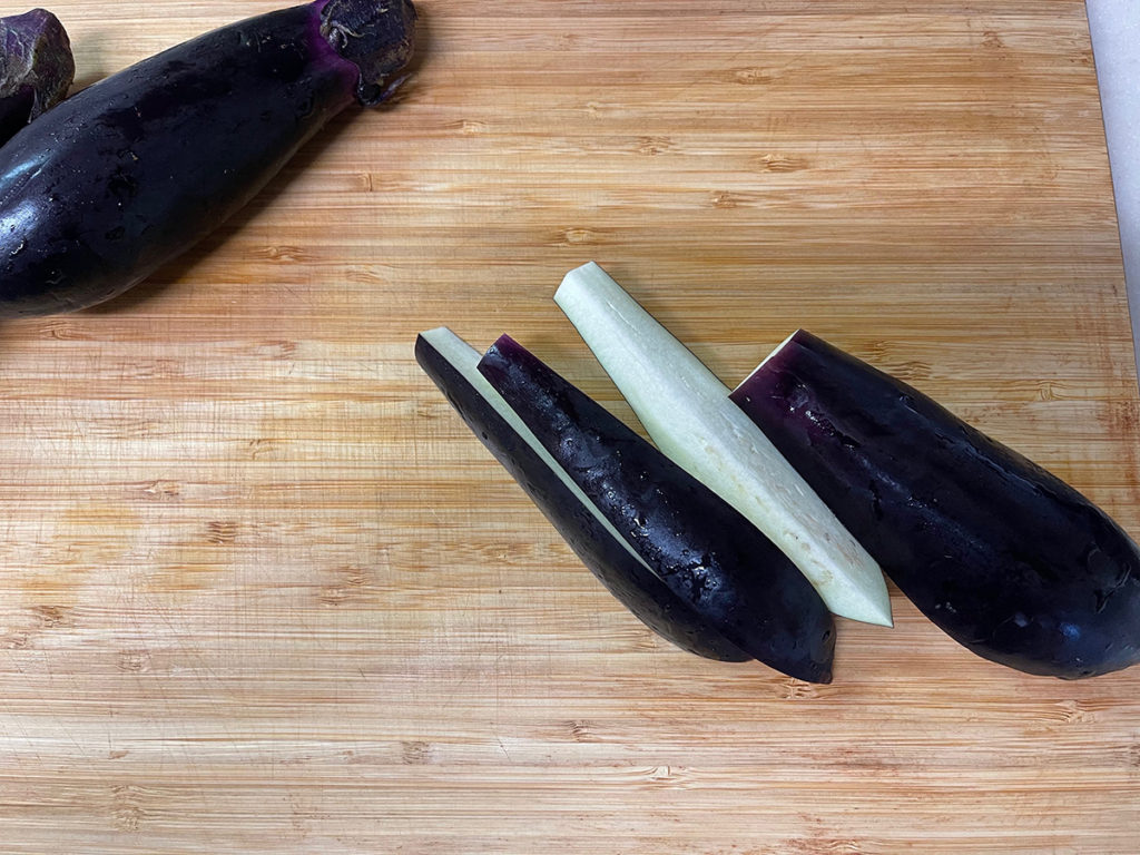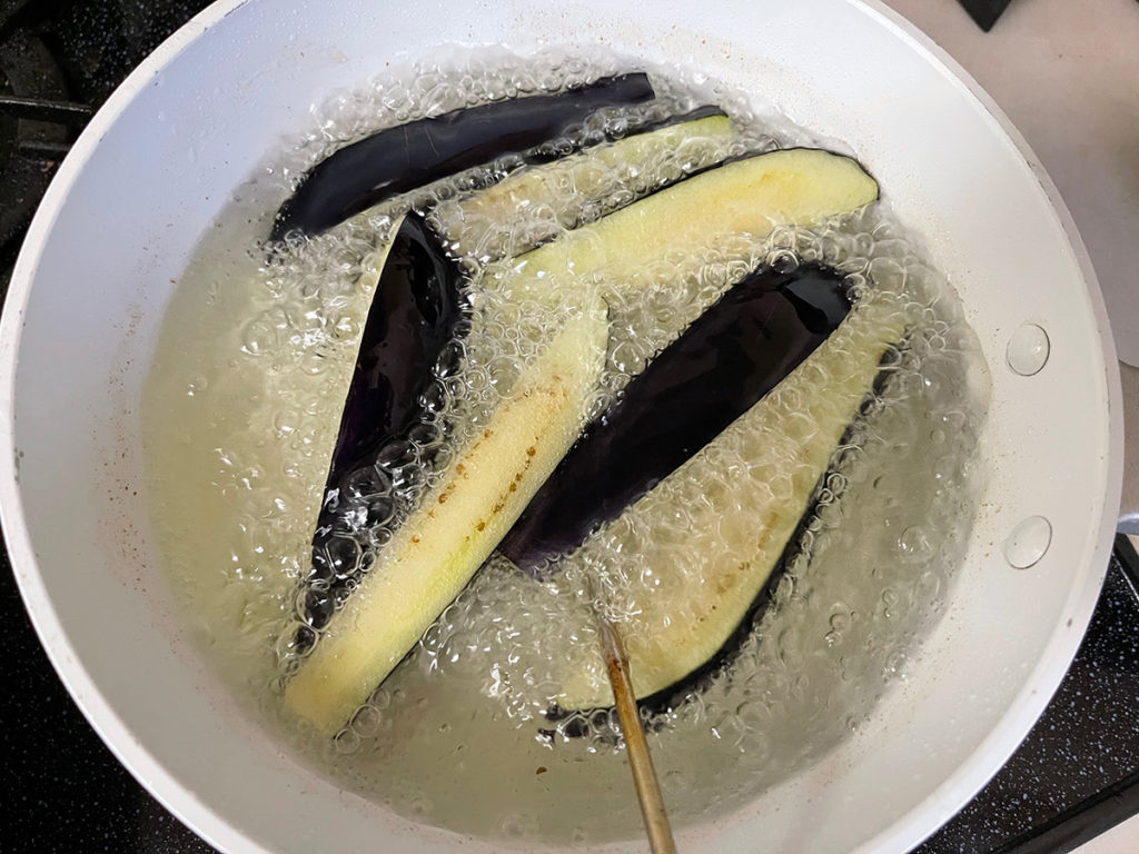 ポイント:ナスを揚げるときは皮目から揚げた方が綺麗に揚がります。