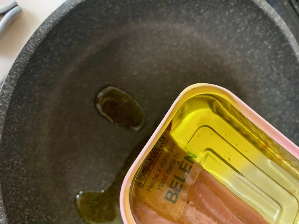 - アンチョビ缶のオイルを適量フライパン入れます。