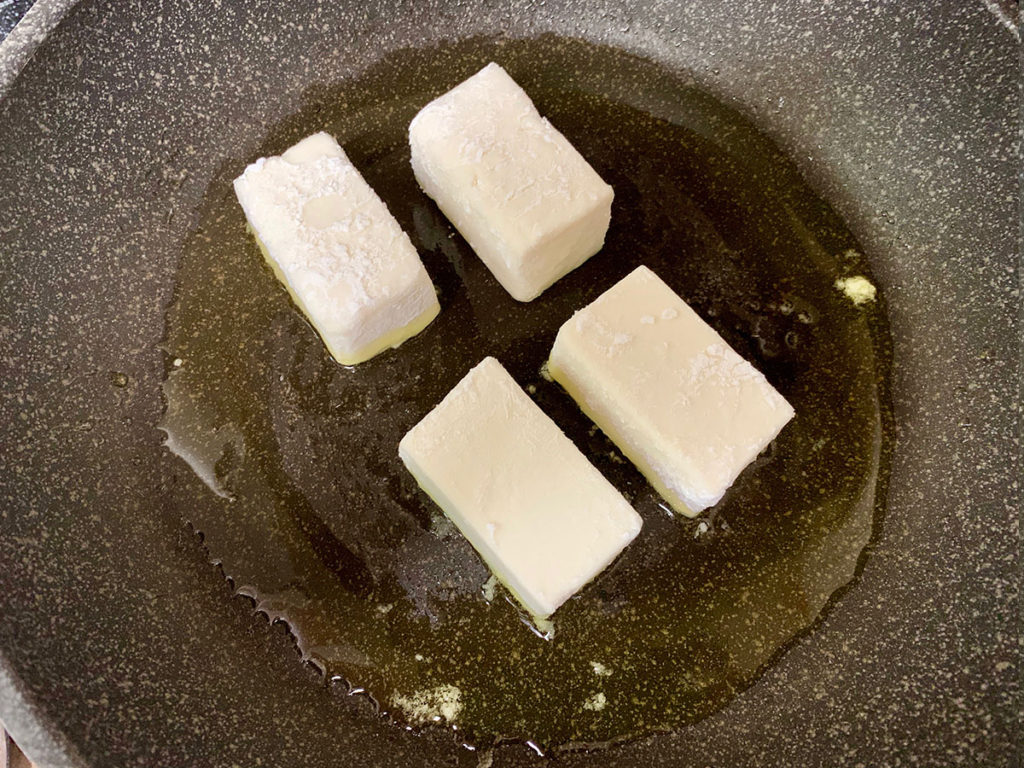 - 豆腐を1/4にカットし、片栗粉をまぶして熱したフライパンにオリーブオイルを入れ焼いていきます。