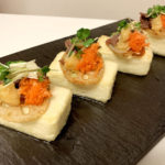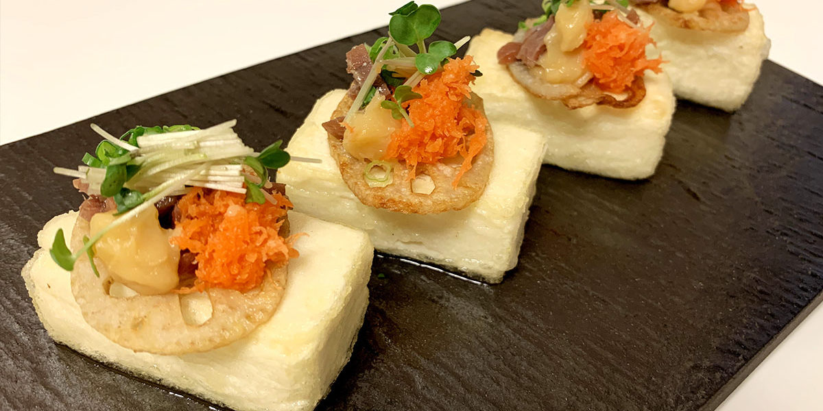 - 豆腐を器に盛り付け、その上に刻んだアンチョビフィレ、蓮根、白味噌、人参おろし、ねぎ、ブロッコリースプラウトを盛り付けて完成です。