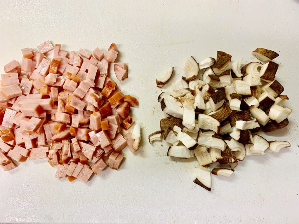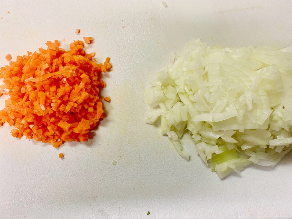 - 温めたフライパンにオリーブオイルをひき、切った玉ねぎ、人参、椎茸を炒めます。