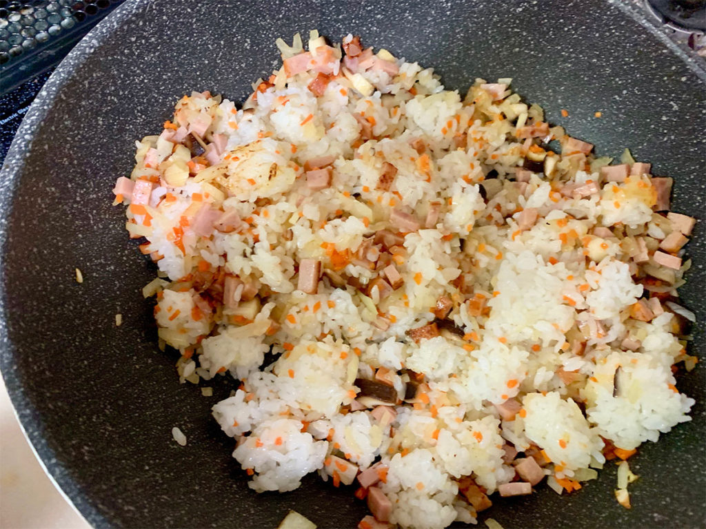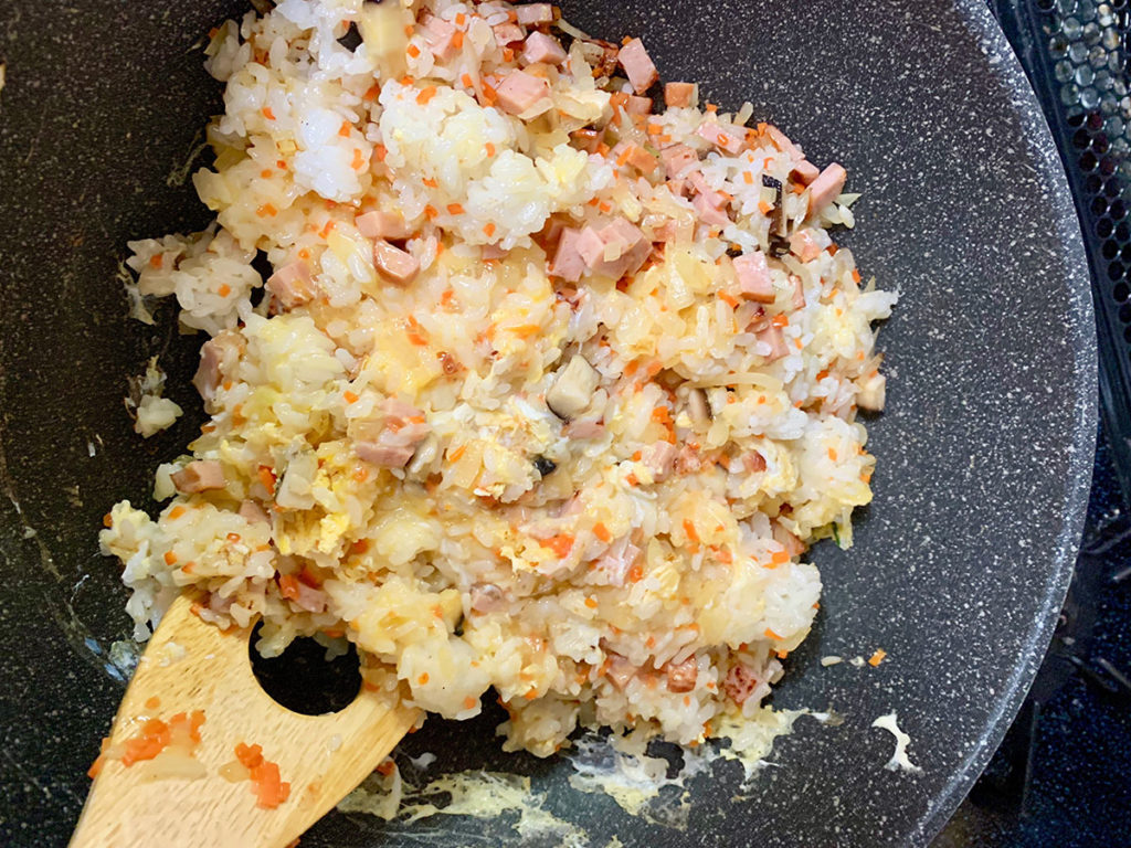 - ご飯を入れて、ほぐしながら具材とからめながら炒めます。