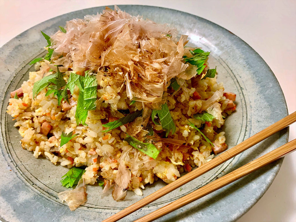 - お皿に盛り大葉、鰹節をのせて完成です。