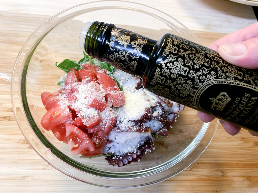 - ボウルに入れ、イタリアンハーブミックス、レモン果汁、粉チーズ、オリーブオイルを入れてざっくり混ぜます。