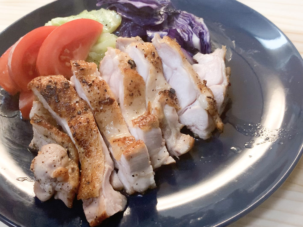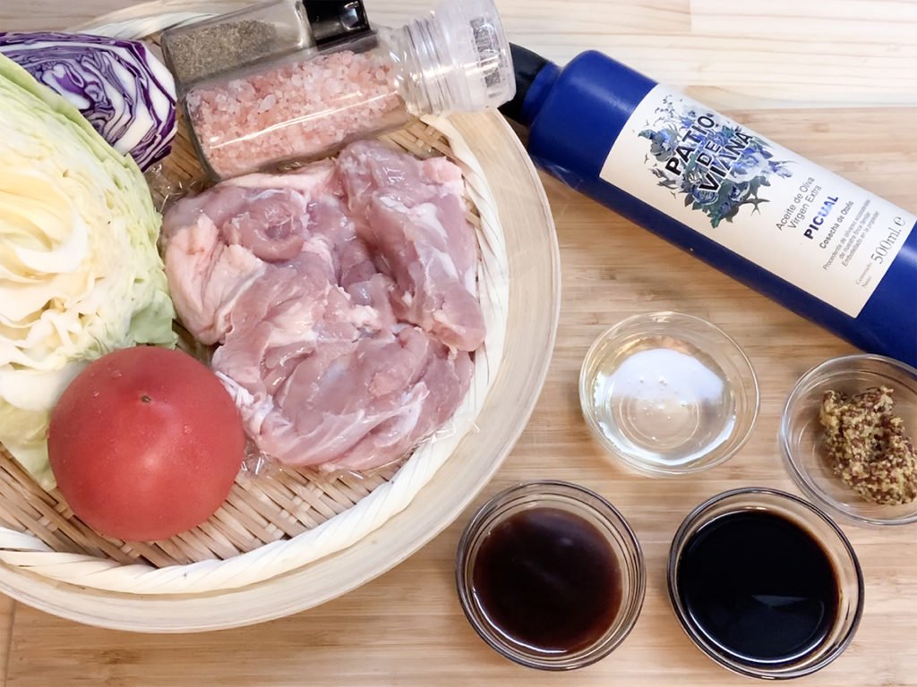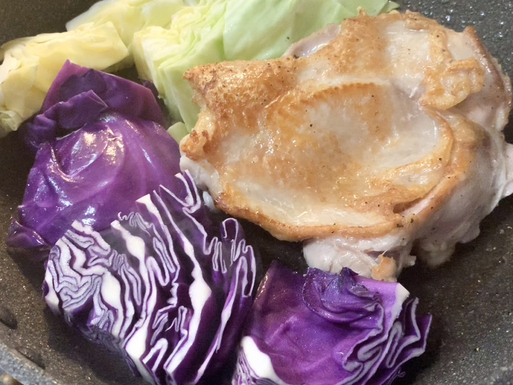- キャベツを取り出し器に盛り付け、モモ肉はきれいな焼き色を付けます。