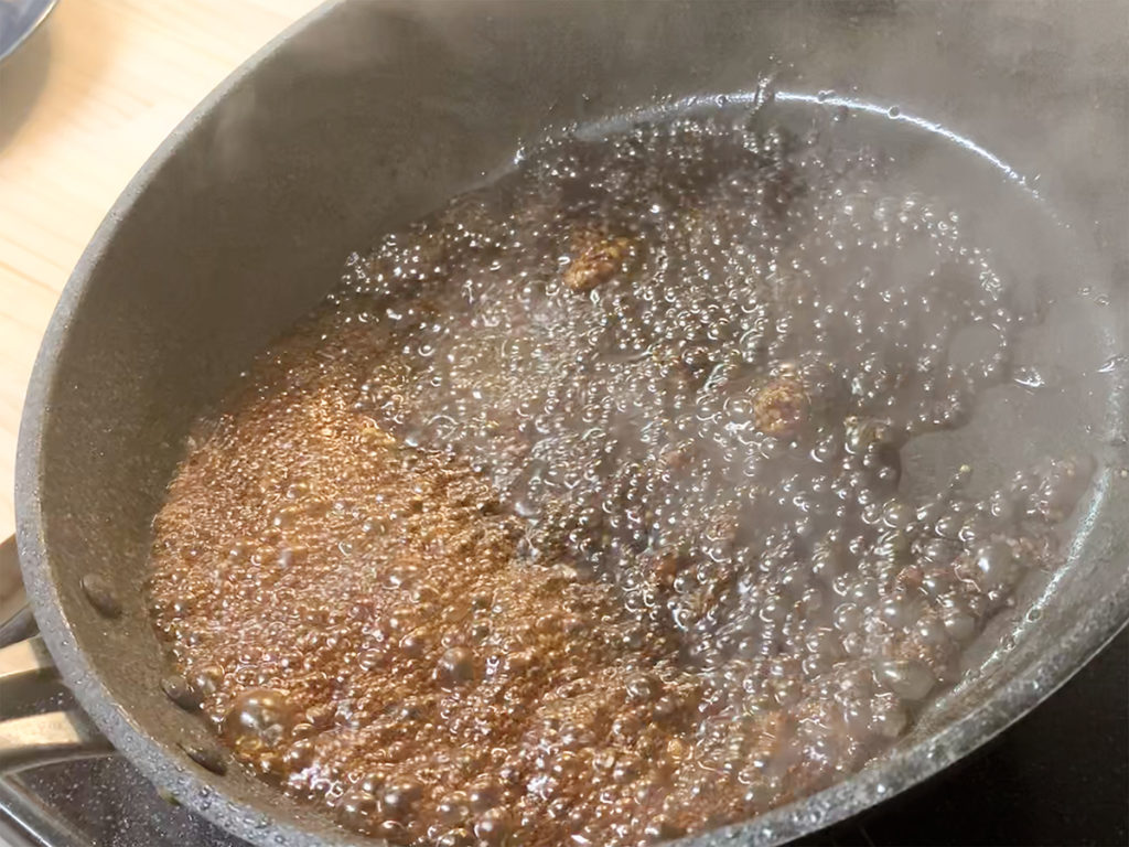 - フライパンはそのまま置いておき、弱火でハニーマスタードソースの材料をすべて混ぜ合わせひと煮立ちしたら火を止めます。