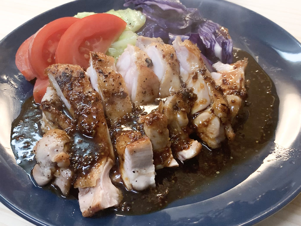 - 盛り付けをしたモモ肉の上から、ハニーマスタードソースをかけて完成です。