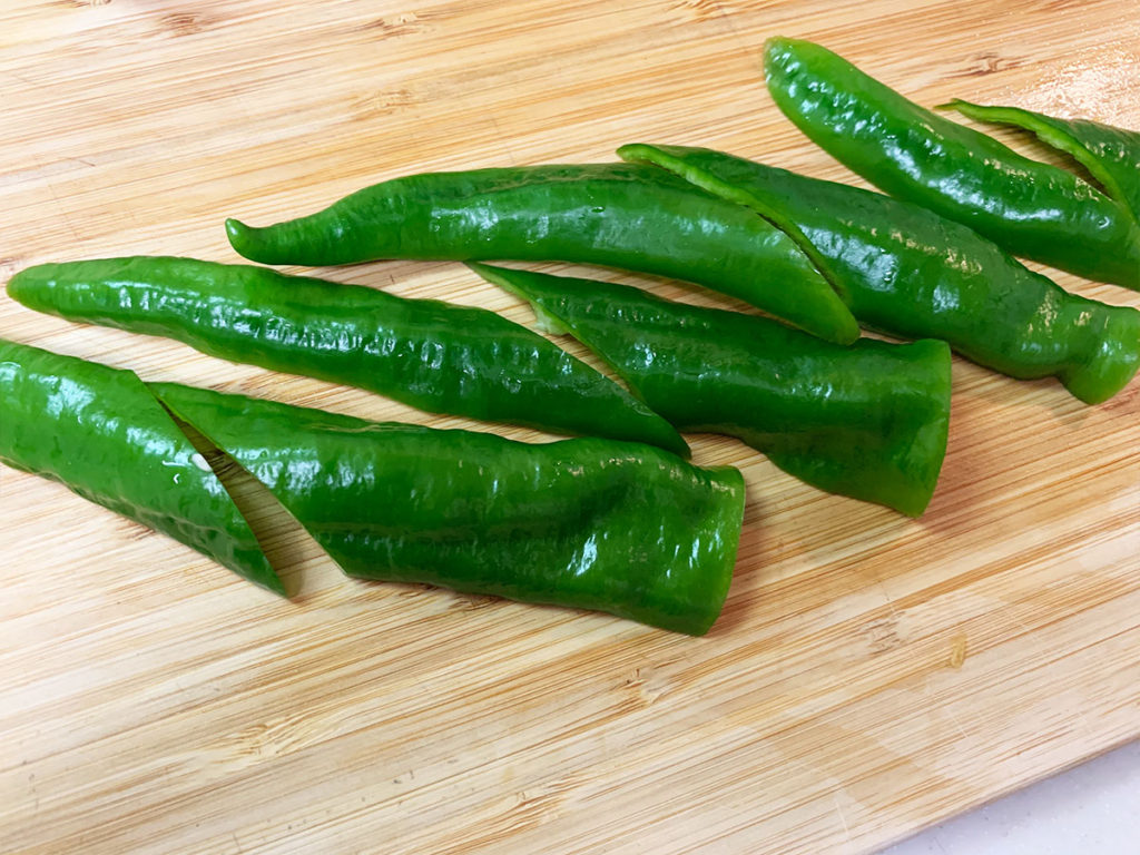 2. 万願寺唐辛子を半分に切り、種を取って斜めにカットします。