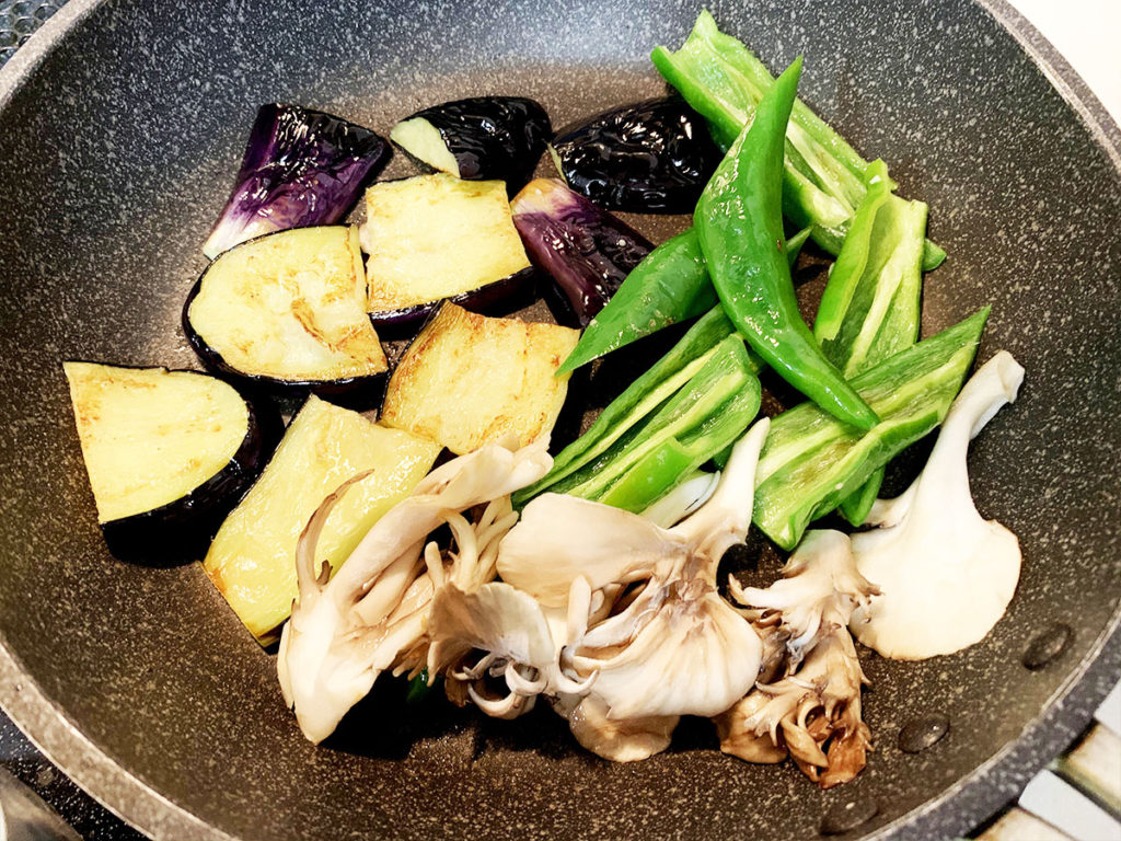 4. 野菜と舞茸を炒めます。