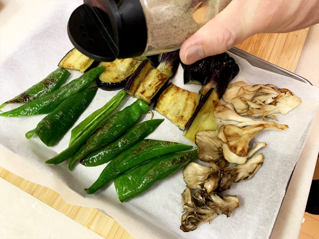 5. 火が入ったものからバットに移し、上から軽く塩胡椒します。