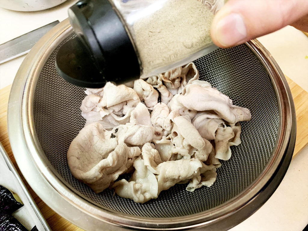 6. 鍋でお湯を沸かし、中火にして豚肉を湯通しします。