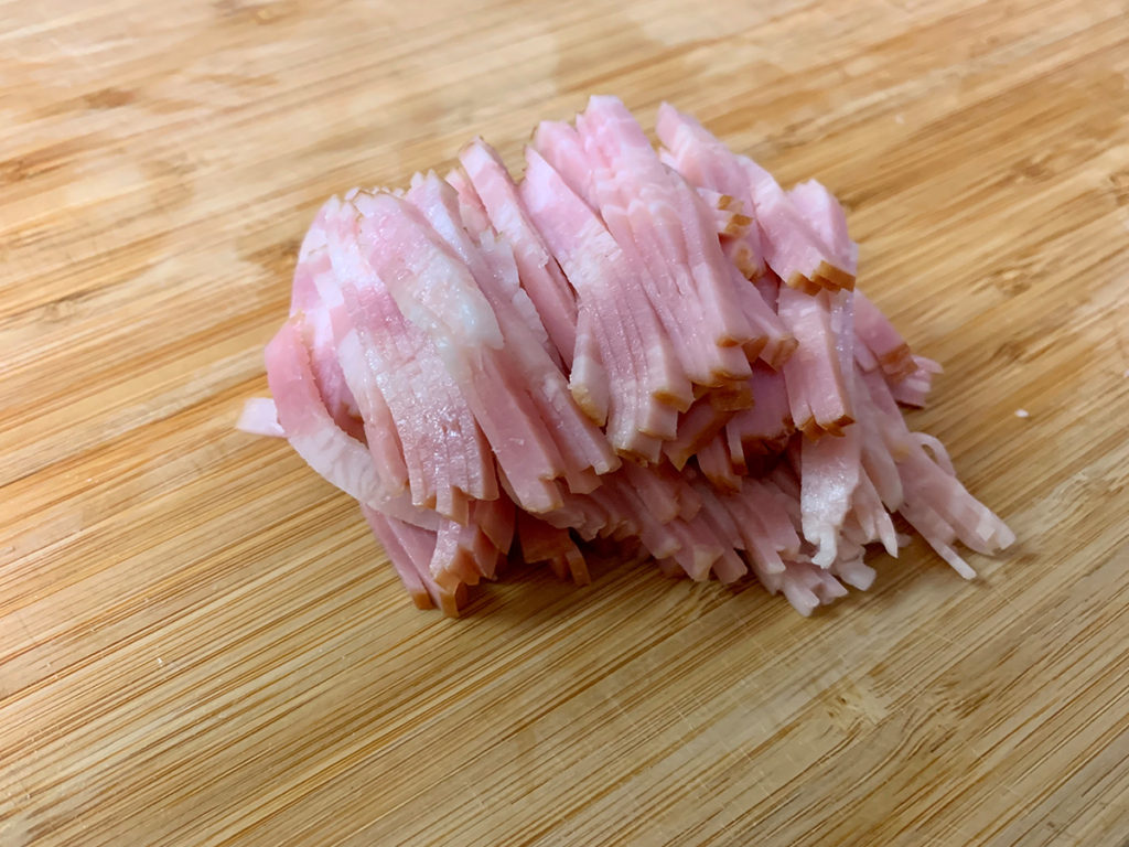 4. ベーコンもジャガイモと同じ厚さに切ります。