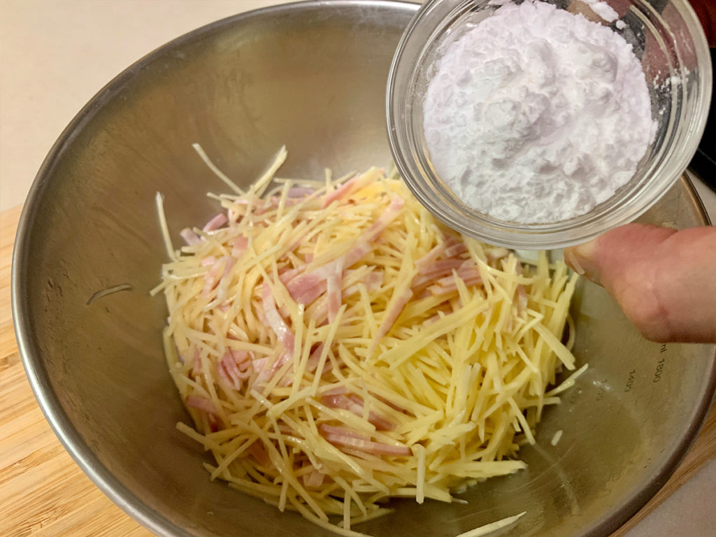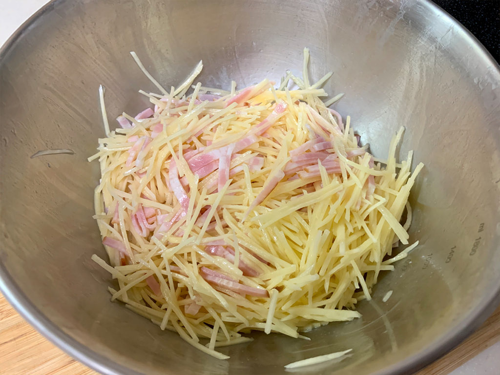 5. ボウルにジャガイモ、ベーコンを入れます。