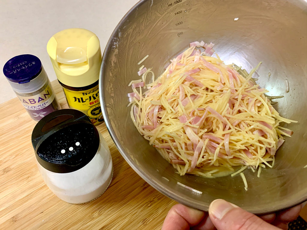 7. 塩胡椒・カレーパウダーで味付けをします。