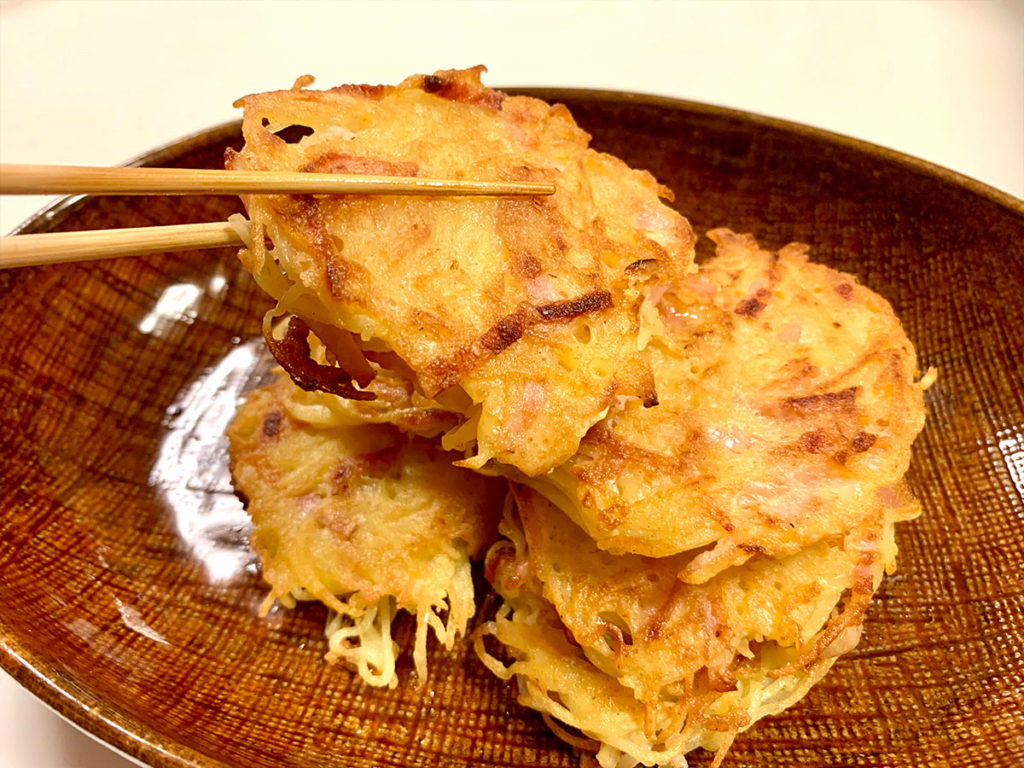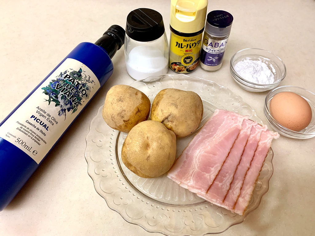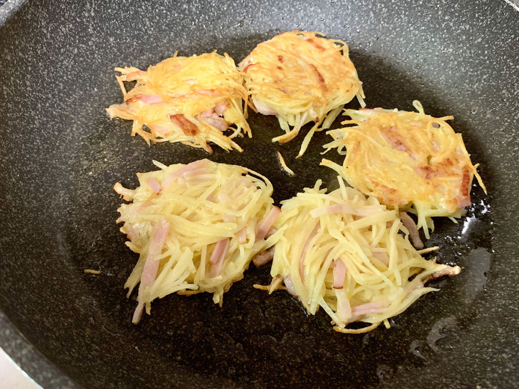 8. 熱したフライパンにオリーブオイルをいれ、円形にとったじゃがいもベーコンを両面こんがり焼けたら完成です。 ポイント:カリッとするまで焼くとぱりっとした食感が楽しめます。