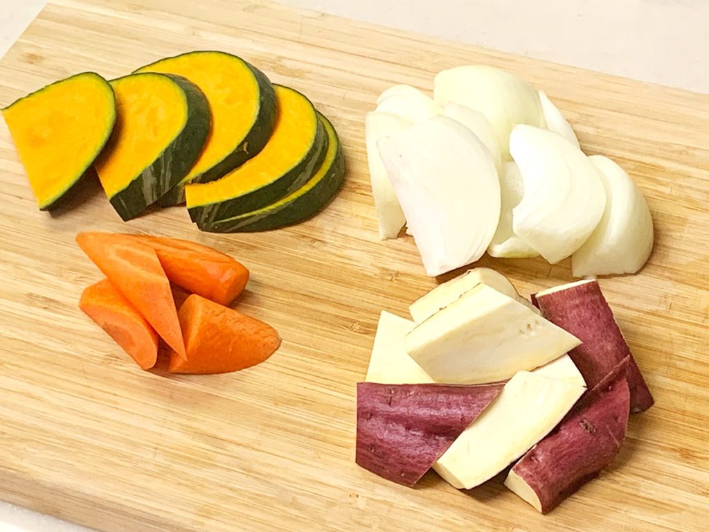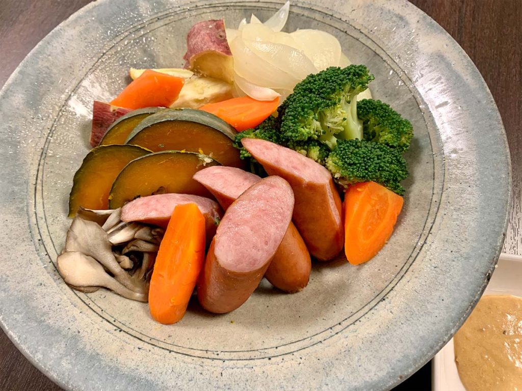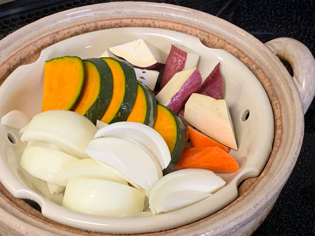- 蒸し器を熱し、蒸気が上がったら火の通りづらい野菜(さつまいも・かぼちゃ・人参・玉ねぎ)を入れ10分蒸します。10分経ったら、ブロッコリー・舞茸・ウインナーを入れ、さらに5分蒸します。