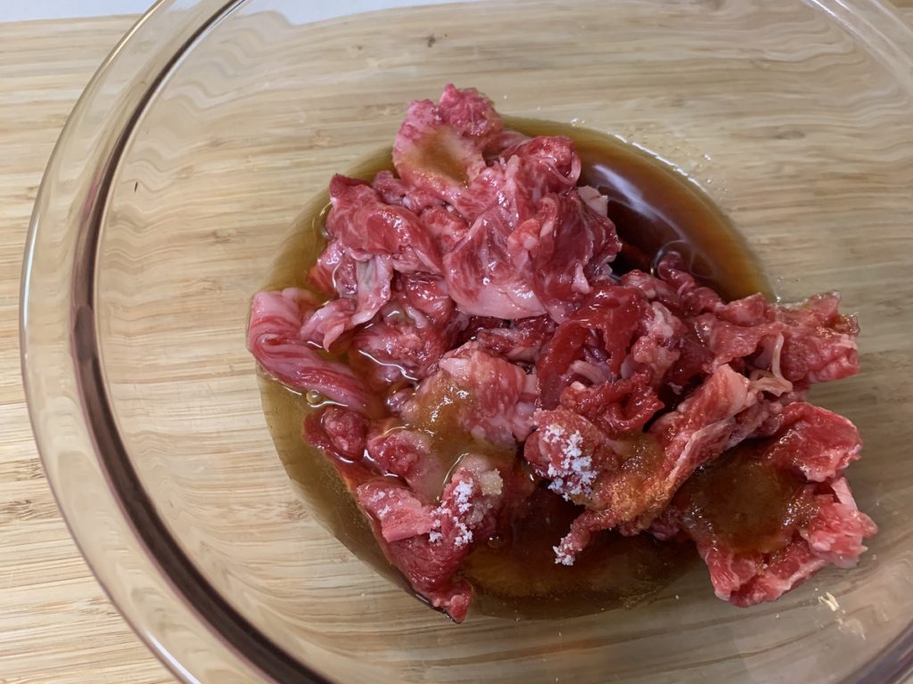 - ボウルに牛肉と合わせ調味料をいれ、混ぜ合わせて10分置きます。