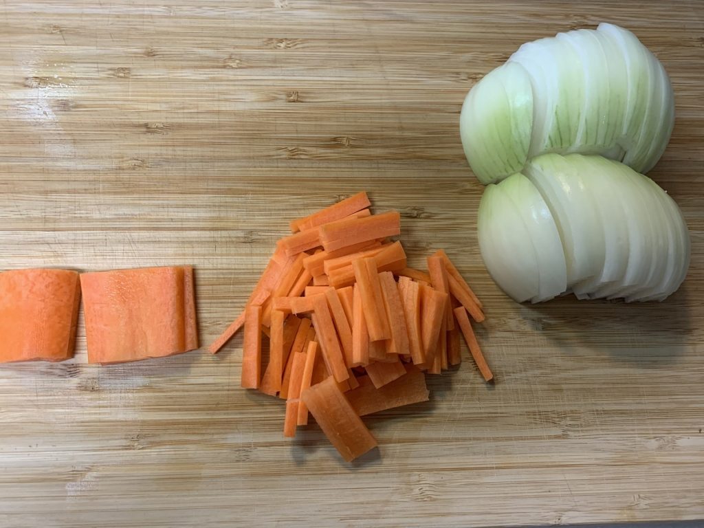 - 玉ねぎを厚めにスライスし、人参は短冊切りにします。