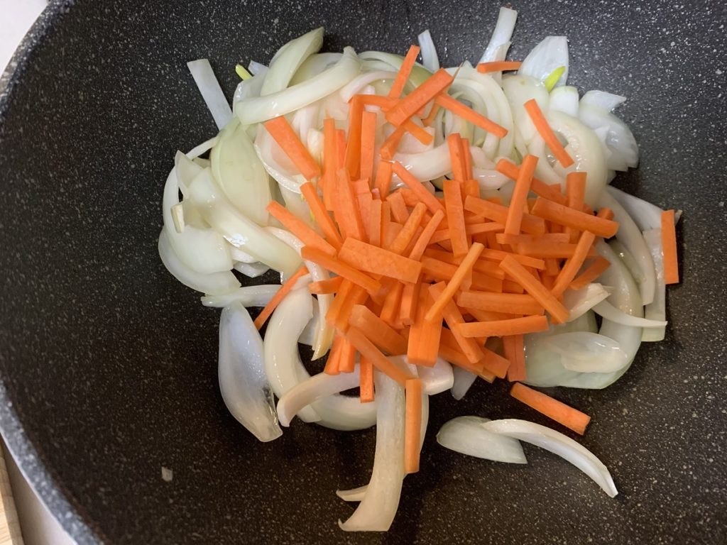 - 熱したフライパンにオリーブオイルを少々入れ、玉ねぎと人参を炒めます。