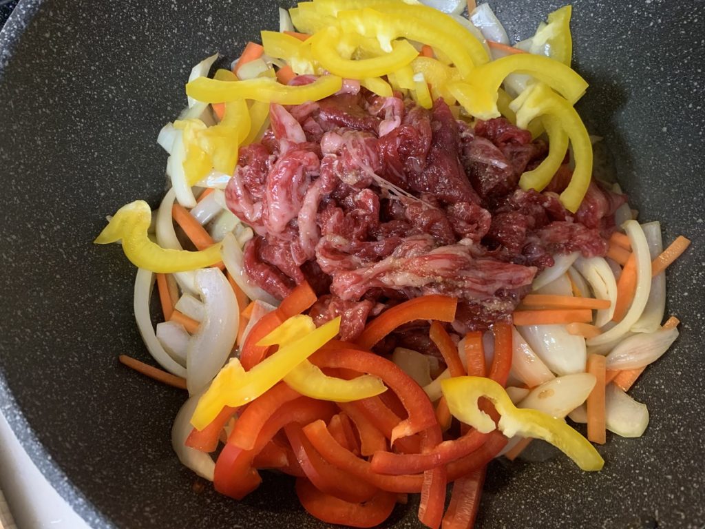 - 火が入りしんなりしたら牛肉、パプリカを入れ炒めます。