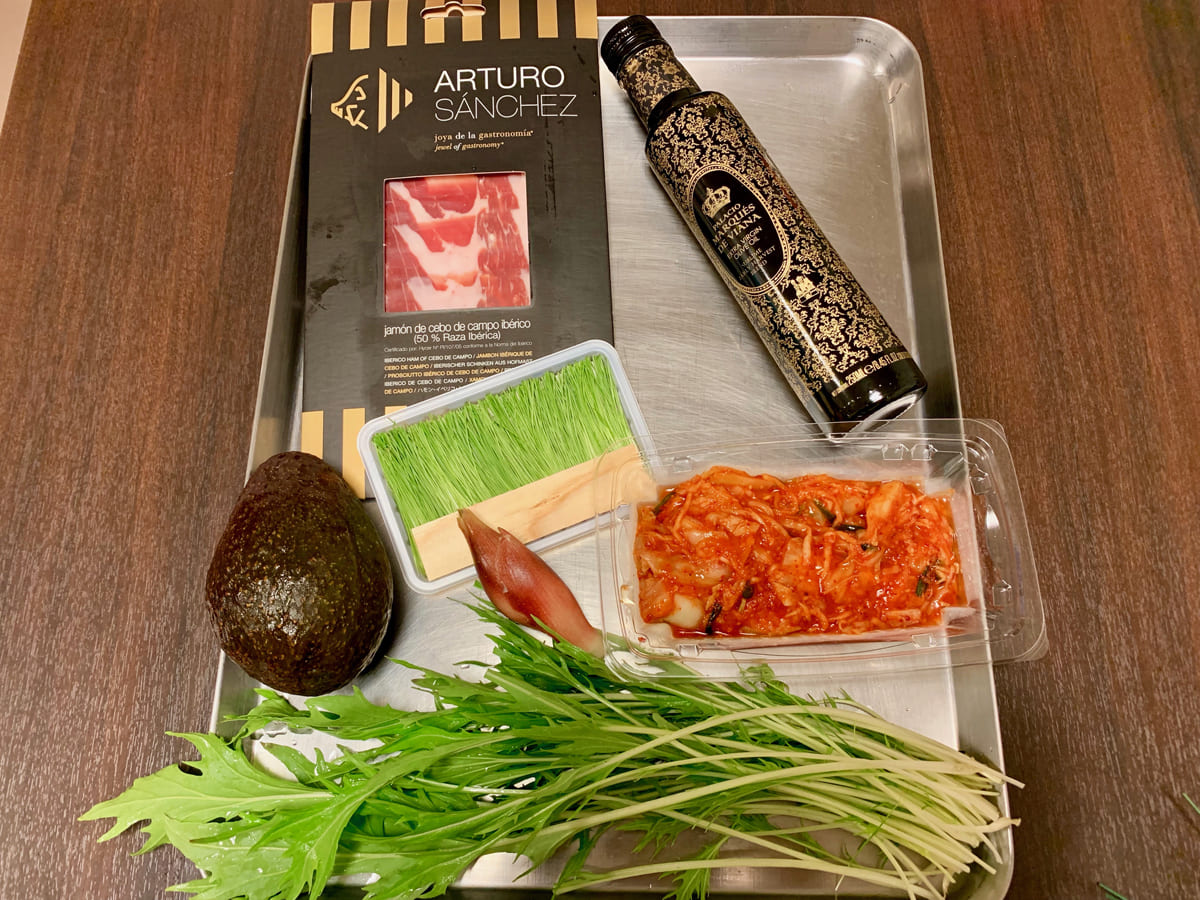 - ボールに生ハム・アボカド・水菜・キムチ・オリーブオイル小さじ1を入れ、