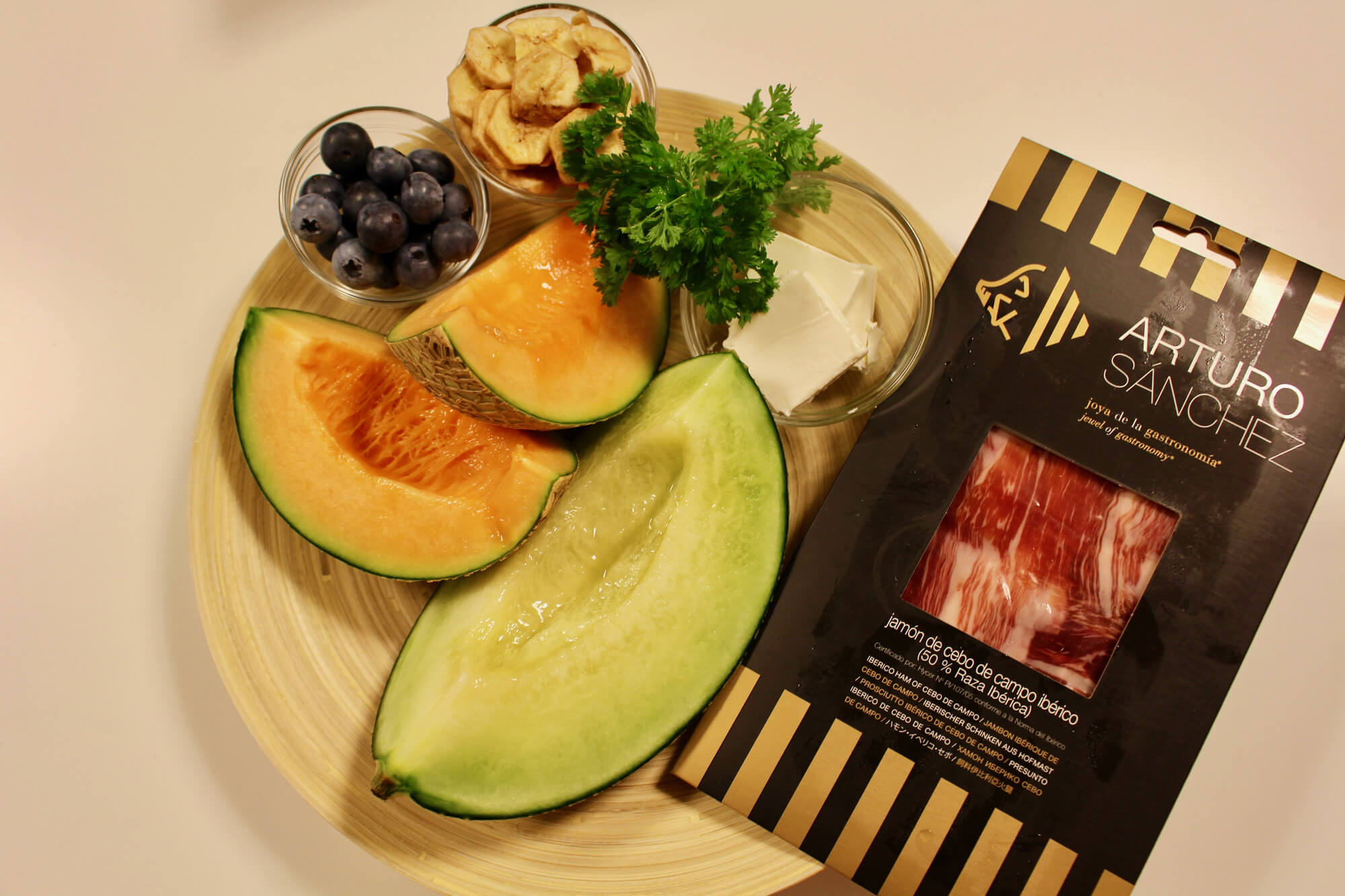 ハモン・イベリコ・セボと二色メロンのフルーツカクテルの作り方