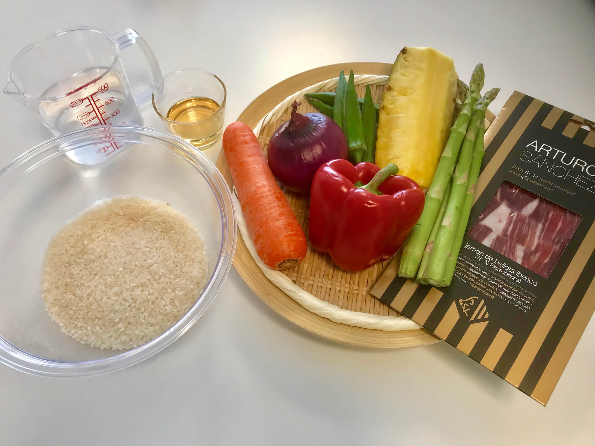 - また寿司飯を少量敷きオクラ、アスパラガスを置き、寿司飯をまた全体に敷き人参・赤玉葱・パプリカ・パイナップルを散らします。