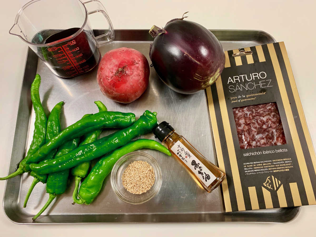- 器に万願寺とうがらし、賀茂茄子、サルチチョンの順に盛り付けます。上からいり胡麻を振りうずまきビーツを添えて完成です。