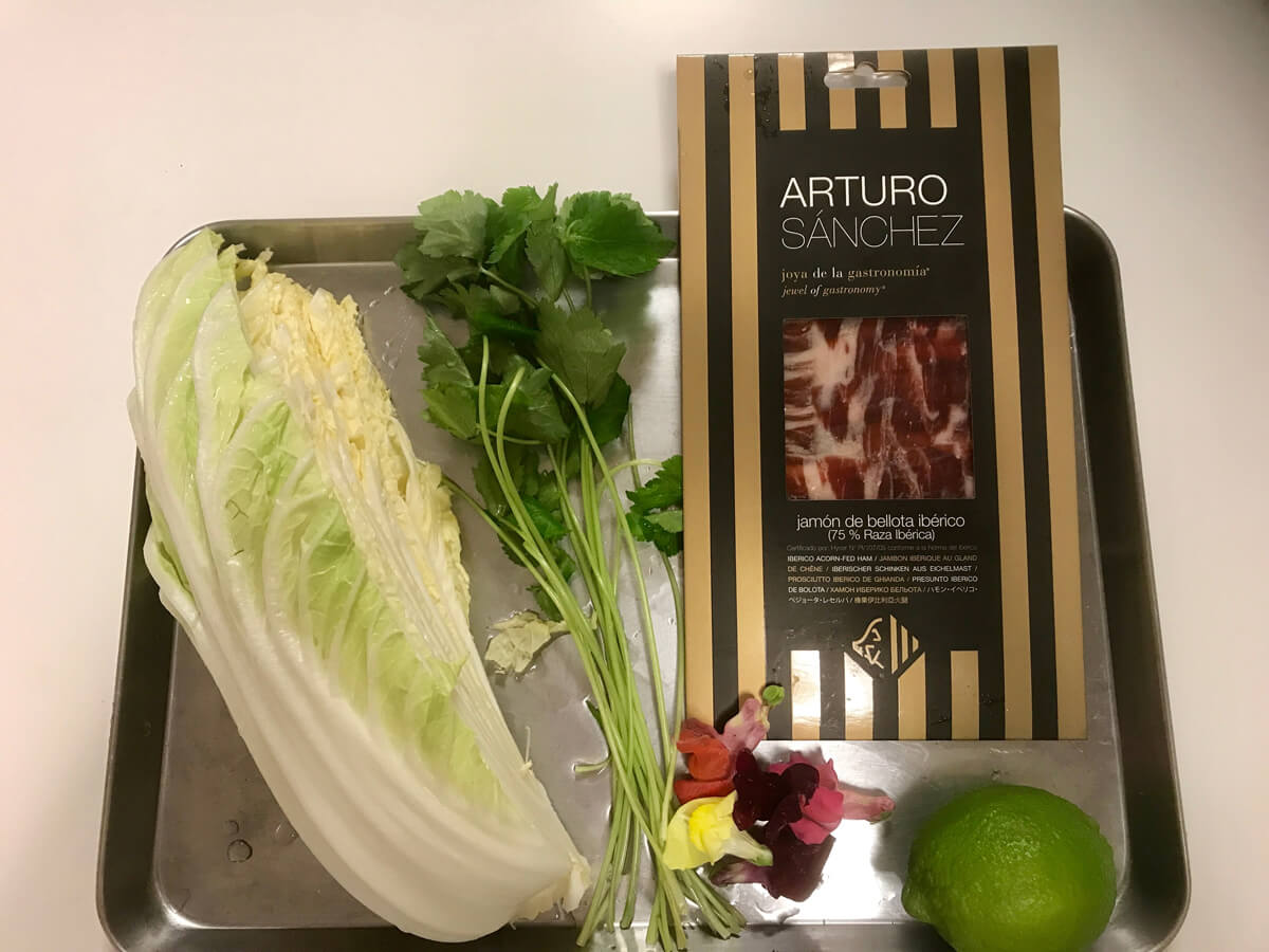 - 器に白菜と生ハムを盛り付け、刻んだ三つ葉とエディブルフラワーを乗せ、ライムを絞って完成です。