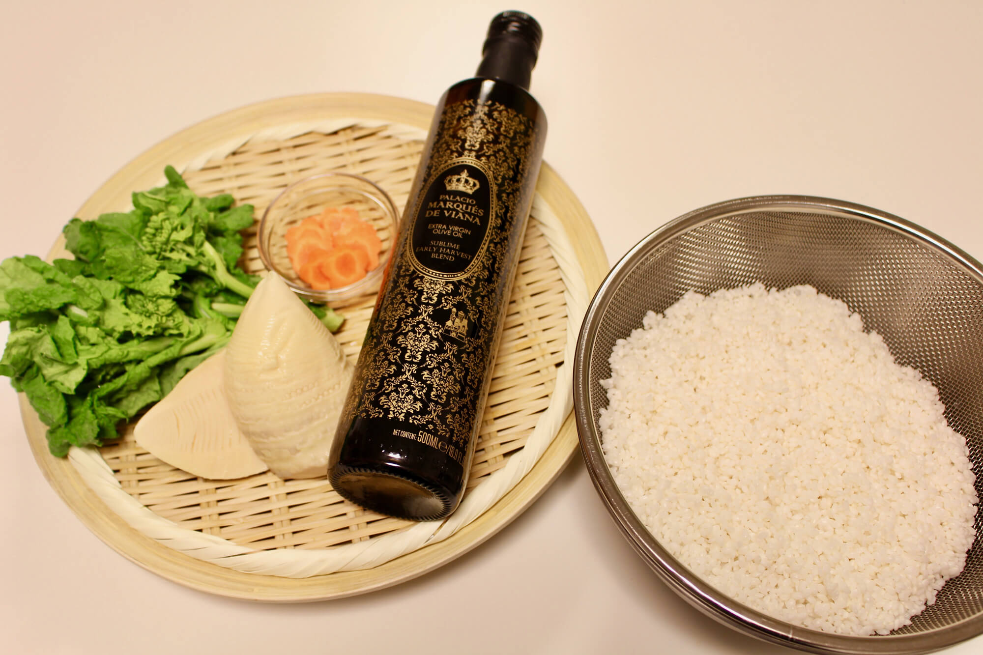 筍を使った春らしい炊き込みご飯です。オリーブオイルの香りをまとった菜の花は炒めて乗せるだけでやみつきに。