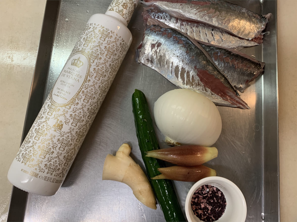 - 器に玉ねぎスライス、茗荷の千切り、きゅうりの笹打ちを盛り付け、オリーブオイルで和えた鯵を乗せて完成です。