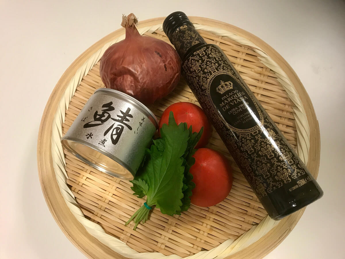 冷蔵庫にあるものと鯖缶、オリーブオイルでできる簡単サラダです。