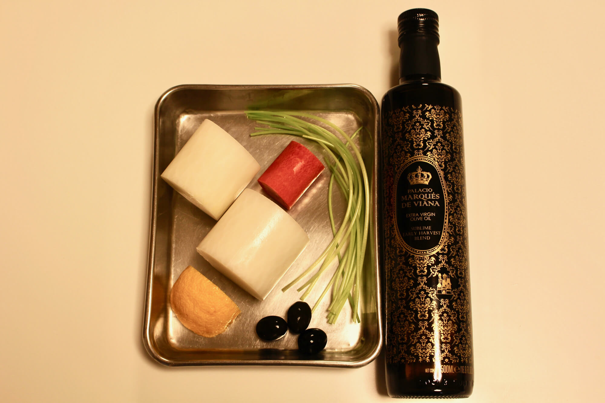 【ポイント】分離しやすいので、よく撹拌してください。 - 大根と人参の水気を切り、柚香オリーブオイルで和えます。オリーブの実をスライスし、混ぜ込みます。