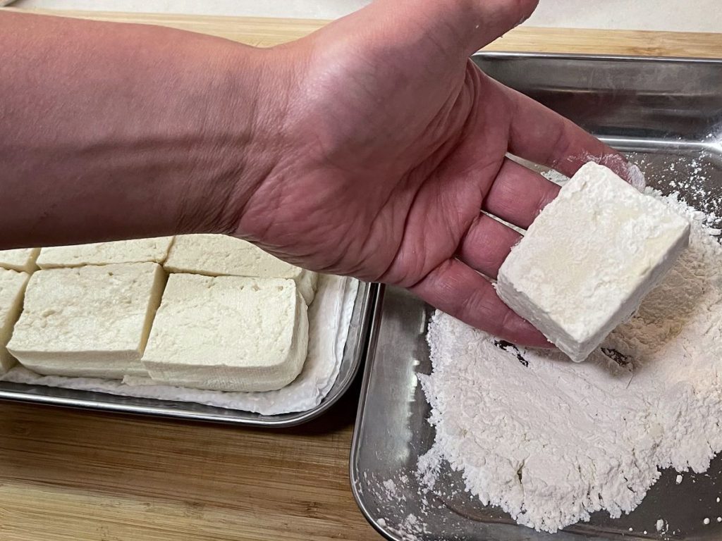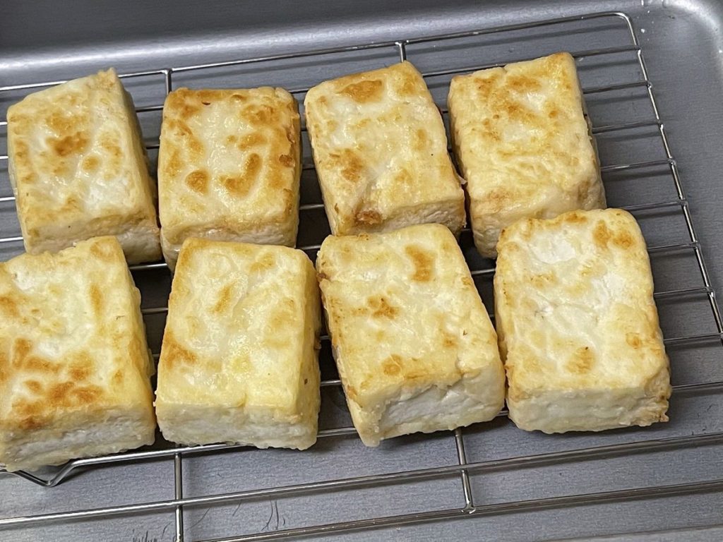 - 豆腐は8等分にカットし、キッチンペーパーで水分をよく拭き取ります。