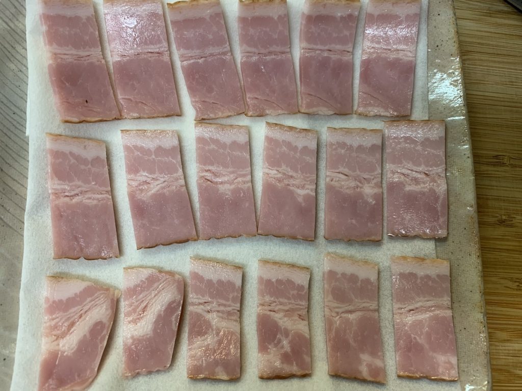- フライパンにオリーブオイル少量をひき、ベーコンをカリカリに焼きます。