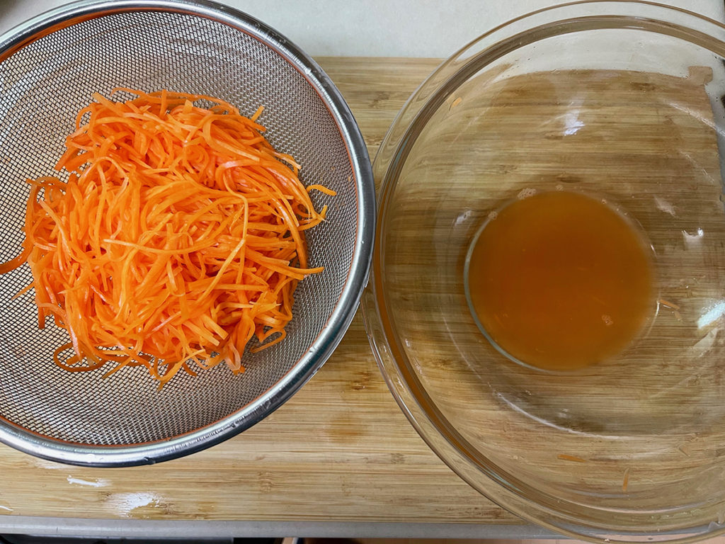 - 人参を絞りながら別のボウルにいれます。
