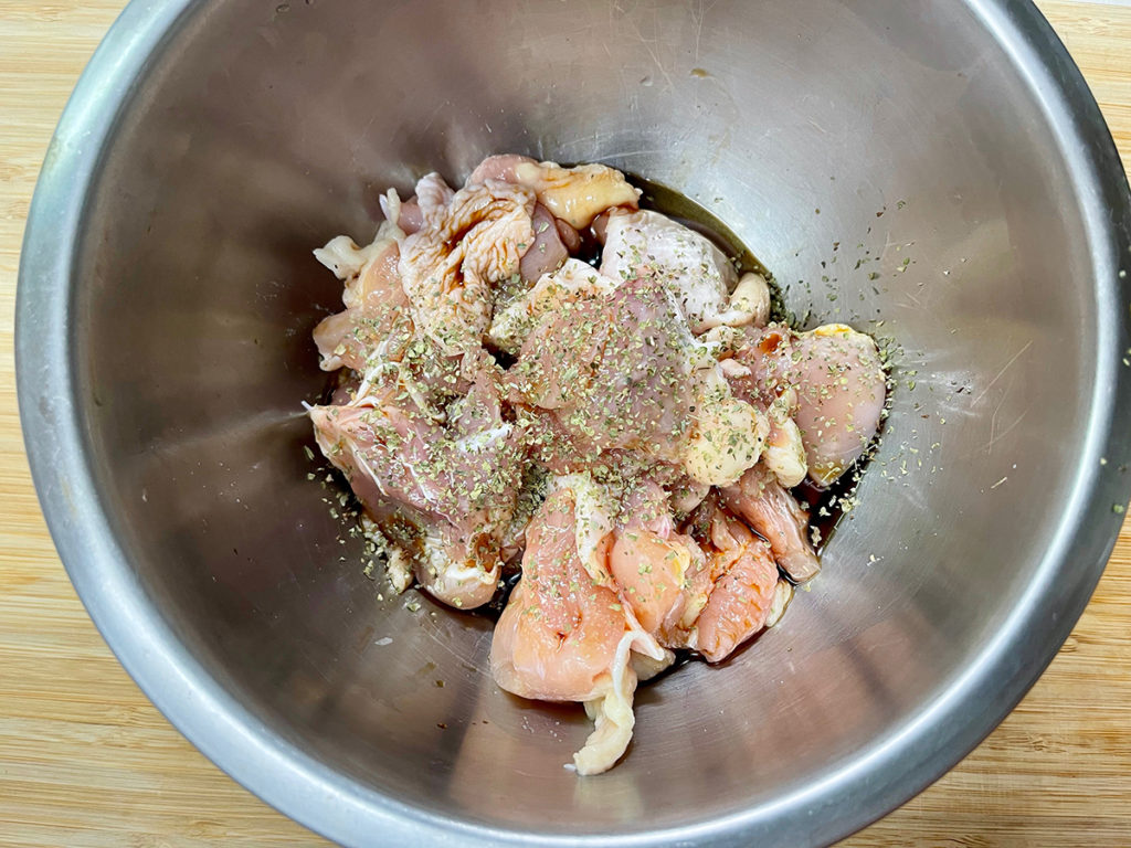 - ボウルに入れて、塩 3g、濃口醤油 小さじ2、味醂 小さじ2、マジョラム適量を入れ軽く揉んで5分程度置きます。