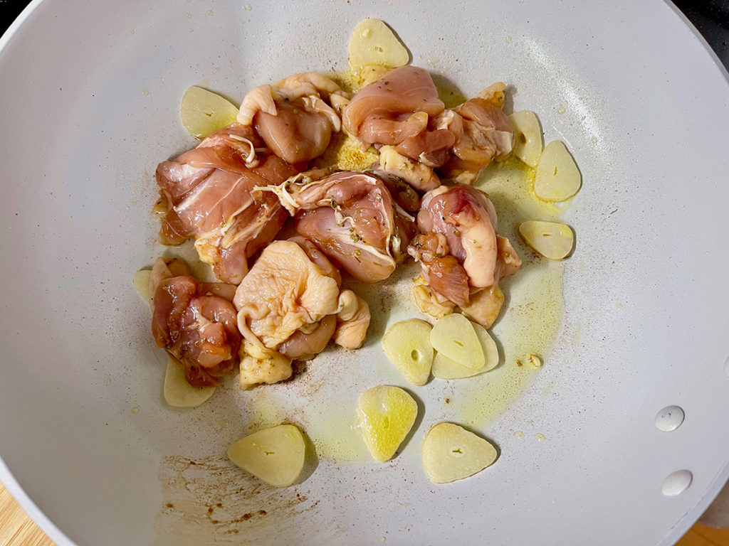 - にんにくを入れ香りが立ったら鶏肉を入れます。