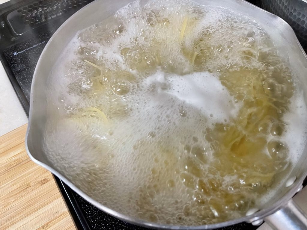 鍋に水2ℓ・塩小さじ1を入れ、沸騰したらパスタを湯がきます。