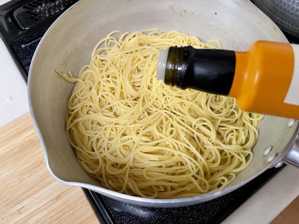 - 湯がき上がったらざるにとり、水気を切ってからボウルに移して、和風顆粒出汁小さじ1、薄口醤油小さじ1、オリーブオイルをいれ、全体を混ぜます。