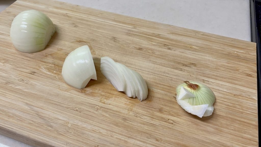 - 玉ねぎは半分にカットし、やや厚めに切ります。