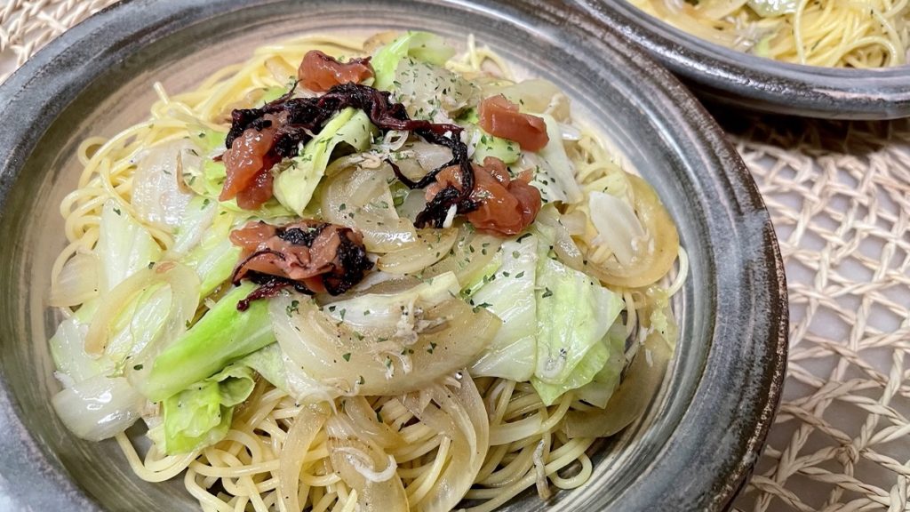 - 器にパスタを盛り付けその上に炒めた野菜をのせます。乾燥パセリを振り梅干しをちぎりながら盛り付けて完成です。