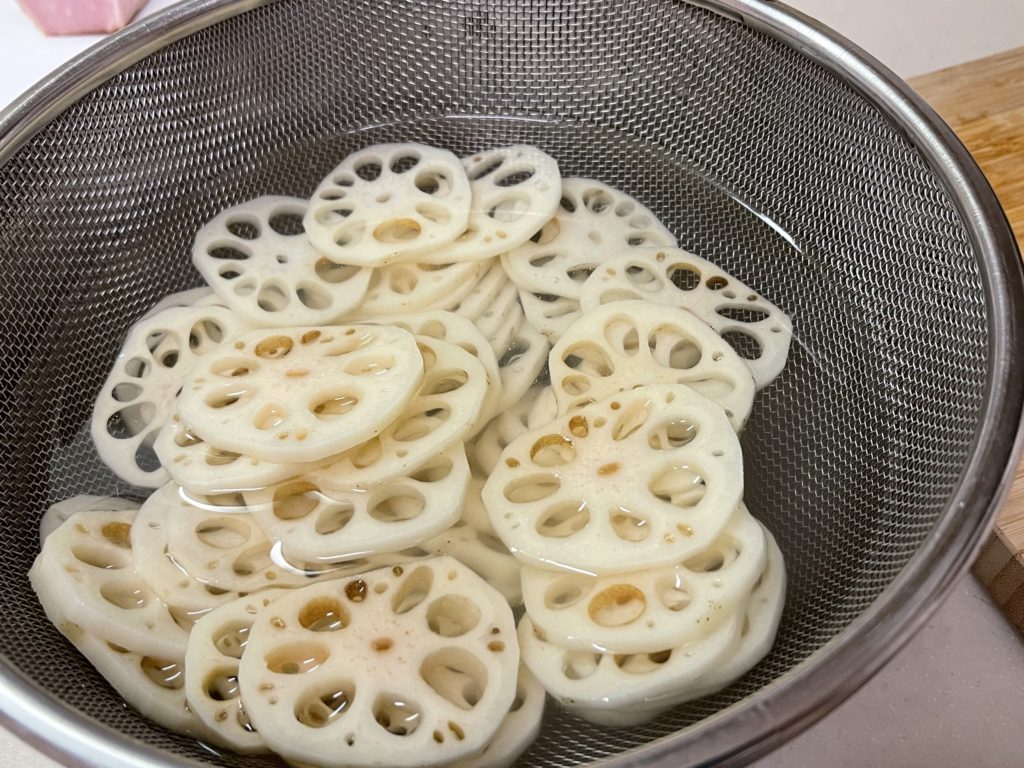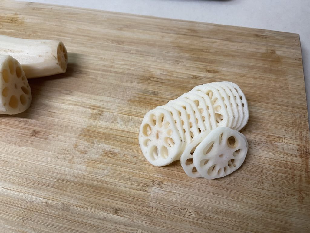 - れんこんの皮を剥き、薄め(0,5㎜程度)にスライスします。