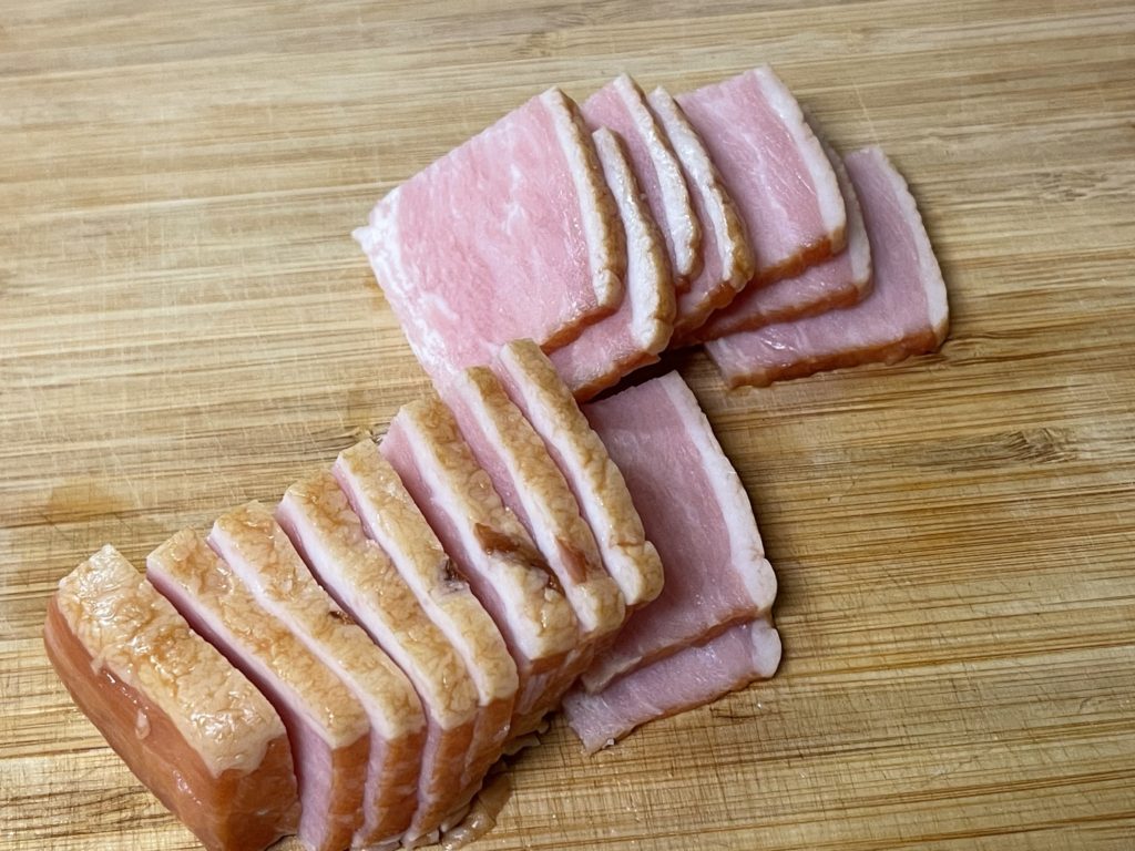 - ベーコンはれんこんと同じくらいの厚さにスライスします。